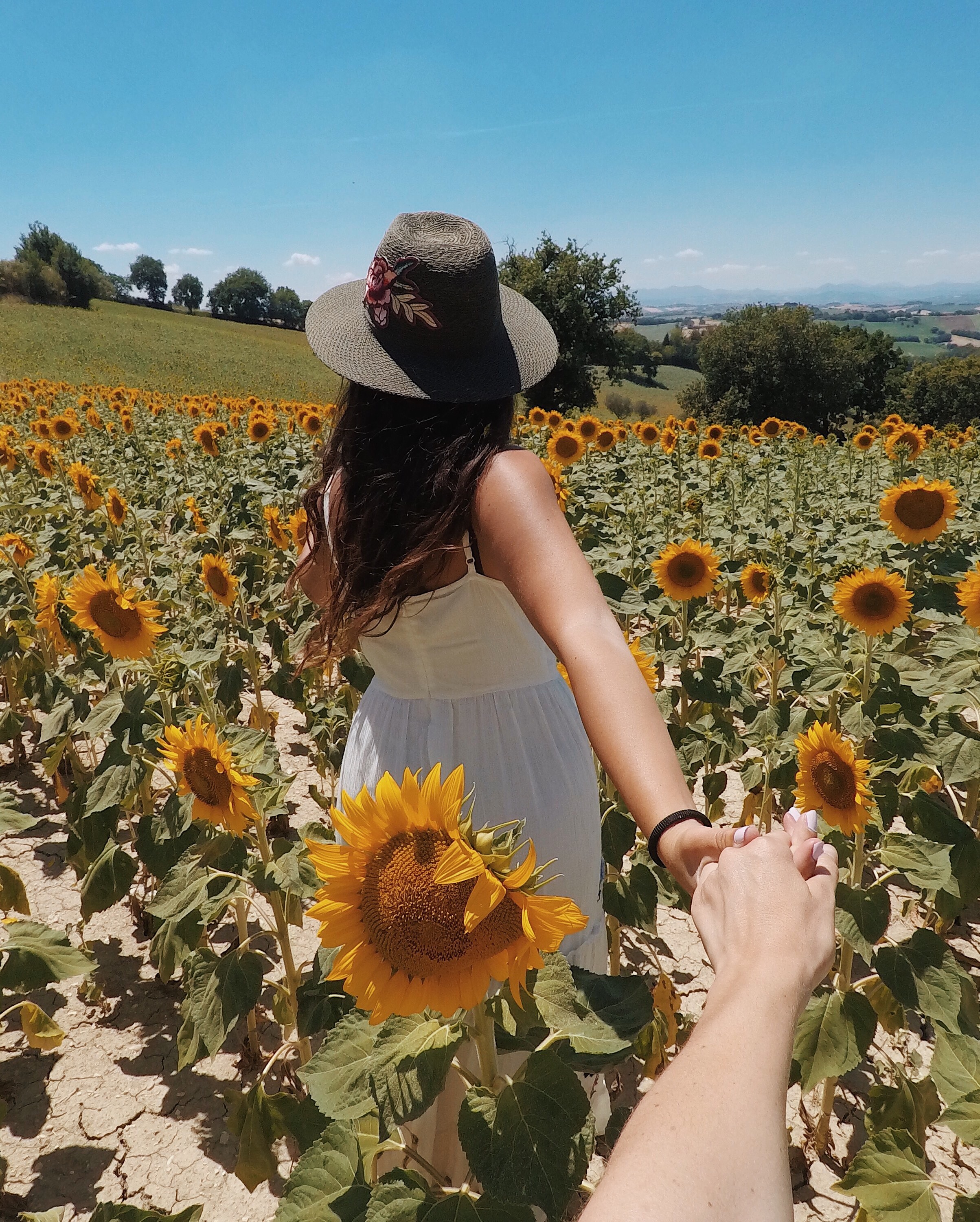 Una delle cose che più amo di un viaggio è osservare dal finestrino il paesaggio che muta lungo gli spostamenti. Da Ancona a Genga il cambiamento è repentino e il panorama regala subito spettacolari scorci naturali dove il verde si alterna all'oro del grano e al giallo intenso dei girasoli. Abbiamo subito fatto una sosta per immergerci nell'atmosfera idilliaca di questa zona e immortalarne la bellezza. A volte le cose semplici offerteci dalla natura sono le più preziose. E le Marche lo ricordano bene.