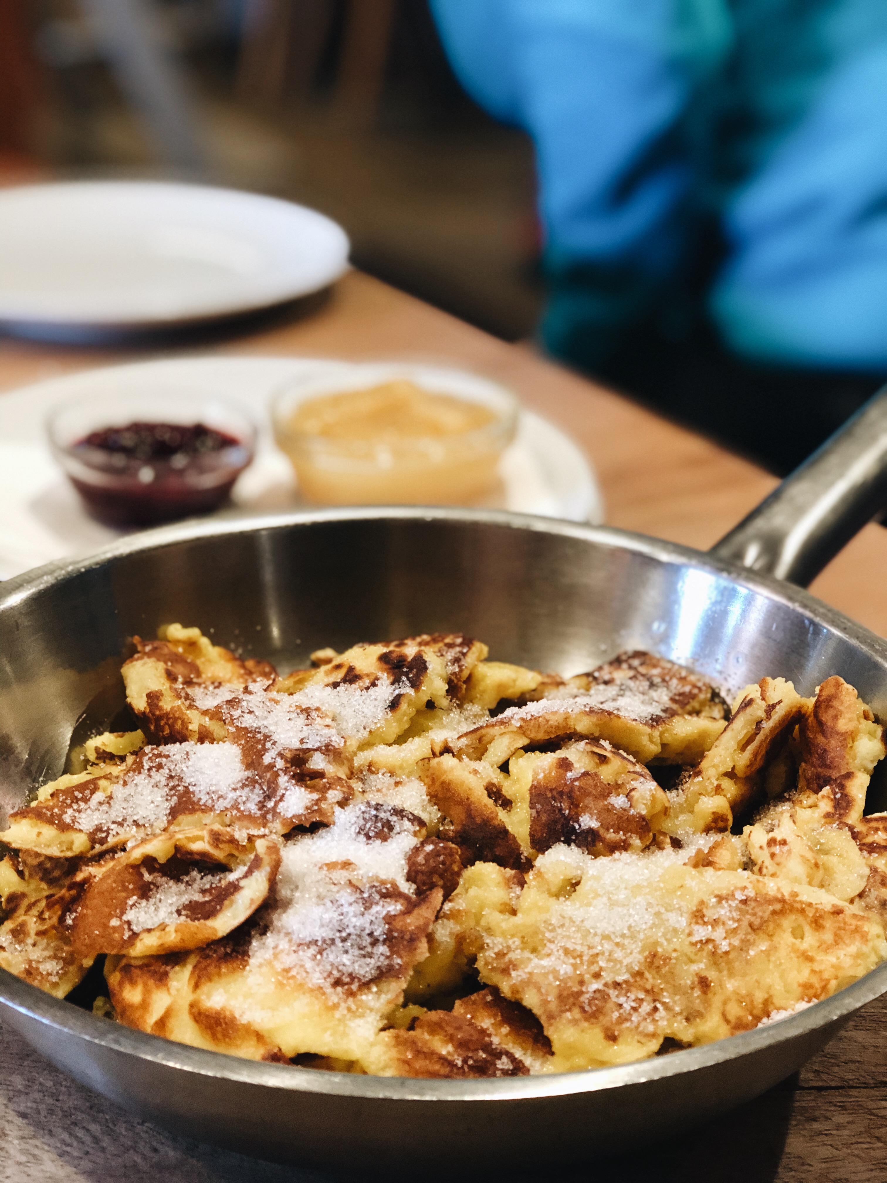 Oltre ai canederli, vi consiglio di provare lo speck locale, gli gnocchetti in salsa di gorgonzola, tutti i i dolci – tutti divini, come il kaiserschmarnn (una sorta di frittata dolce accompagnata da marmellata di mirtilli rossi). E dulcis in fundo, lo yoghurt locale, che per me è strepitoso.
