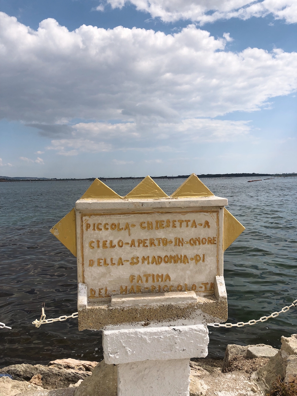 Noi rimaniamo sconvolte dallo scenario. Un vero e proprio mix tra sacro e profano. Dalla scritta Piccola chiesetta a cielo aperto in onore della Madonna di Fatima del Mar Piccolo incisa sulla pietra, alle frasi della processione dedicate a Gesù, fino al pulitore di cozza sotto la sua capannina al riparo dal sole con la sua suoneria del cellulare Jerusalema che all’improvviso suona all’impazzata.