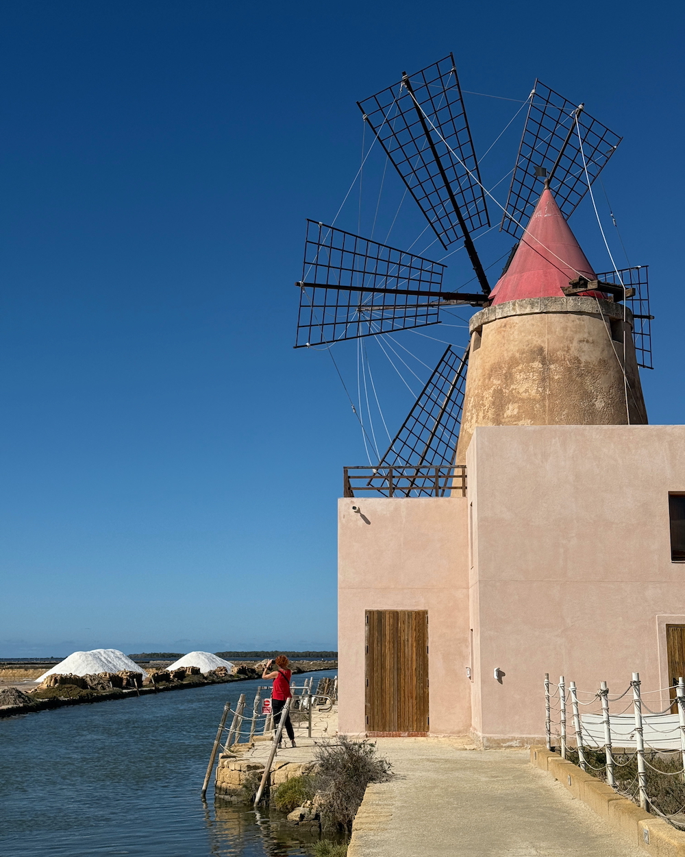 Partiamo di mattina verso le Saline Ettore e Infersa, nel cuore della Riserva Naturale dello Stagnone di Marsala. Il mulino del XVI secolo che accoglie i visitatori è già di per sé uno spettacolo — le pale che girano lentamente contro il tramonto rosa (o contro il sole del mattino, in questo caso) sono una delle immagini più iconiche della Sicilia. Questo è il posto giusto per apprendere tutto ciò che si cela dietro il mondo del sale: il duro lavoro, l'antica tradizione.